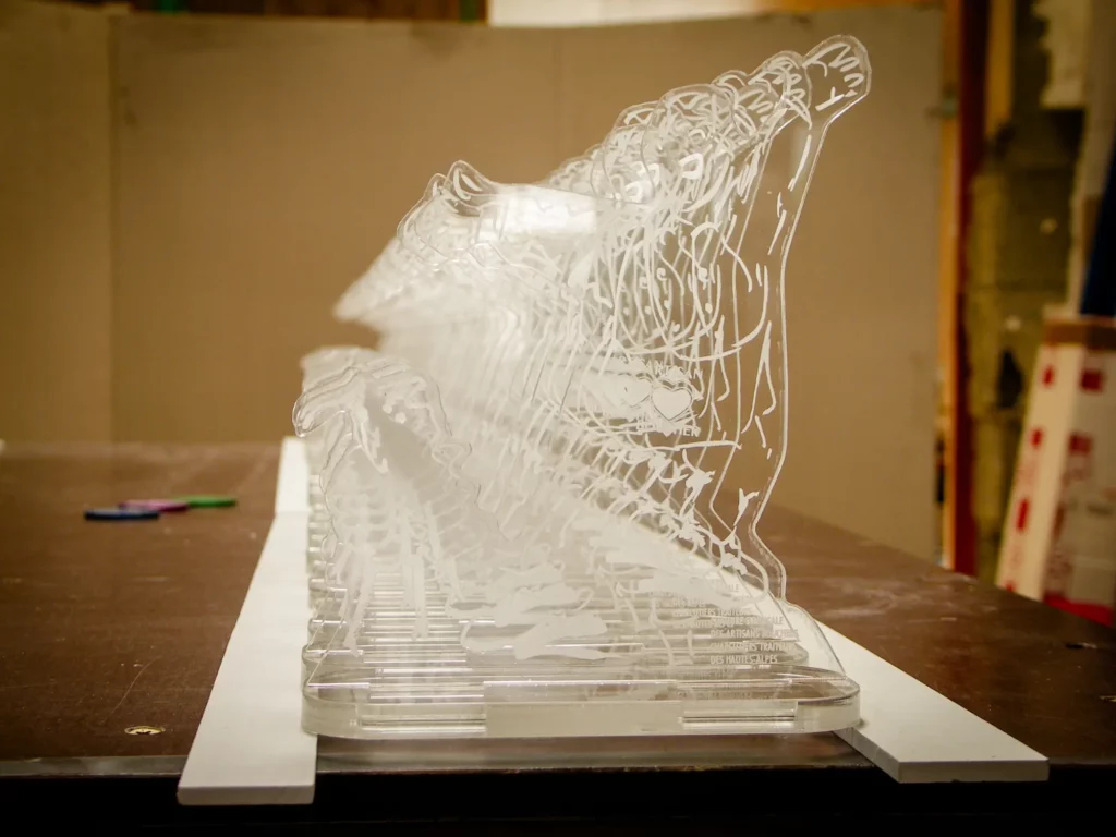 Nous façonnons, découpons et gravons la matière avec précision, en combinant lasers, CNC et jet d’eau pour transformer vos idées en objets durables, de la conception à la fabrication.