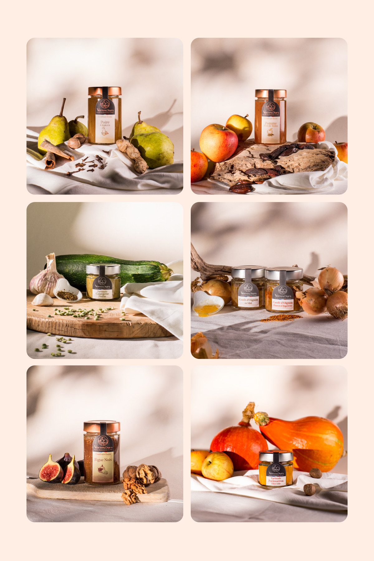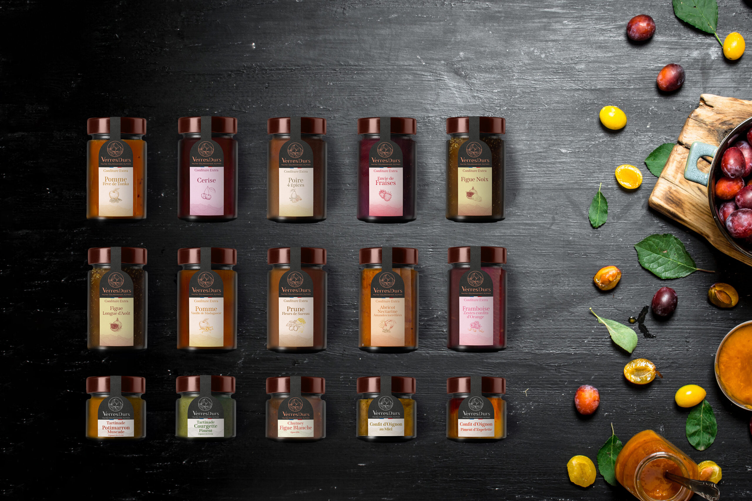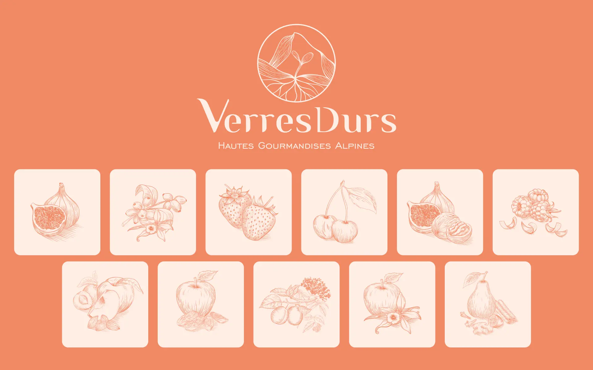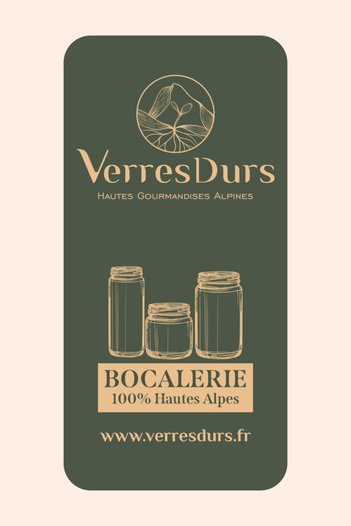 Pour Verres Durs, bocalerie 100 % végétale nichée dans le Valgaudemar, nous avons imaginé une identité visuelle complète : logo, illustrations et gamme d’étiquettes.