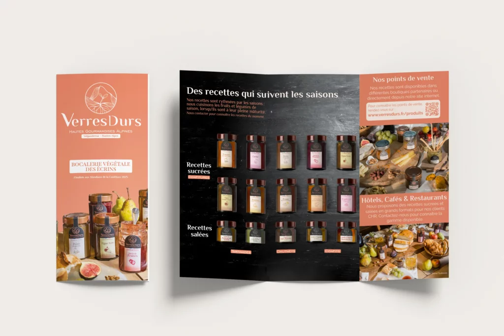 Plus qu’un simple outil d’information, le dépliant devient un objet à part entière, fidèle à l’engagement végétal, au territoire et à la gourmandise alpine qui définissent Verres Durs.
